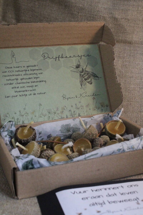 Kaarsjes gegoten in natuurlijke doppen: van eikeldopjes en walnootschalen. Met een klein lontje en pure bijenwas worden ze kleine lichtbootjes, klaar om te drijven op water of te rusten in zand. Ze branden kort en warm, soms met een knisperend randje als de dop mee oplicht. Een ritueelkaarsje voor verjaardagen, wensen, of momenten van loslaten. Verkrijgbaar per stuk of in setjes: – Eikendopjes (± 20 stuks) – Walnootdopjes (± 10 stuks) – Gemengd doosje met beide soorten Elk dopje is uniek, zoals de natuur ze maakt.