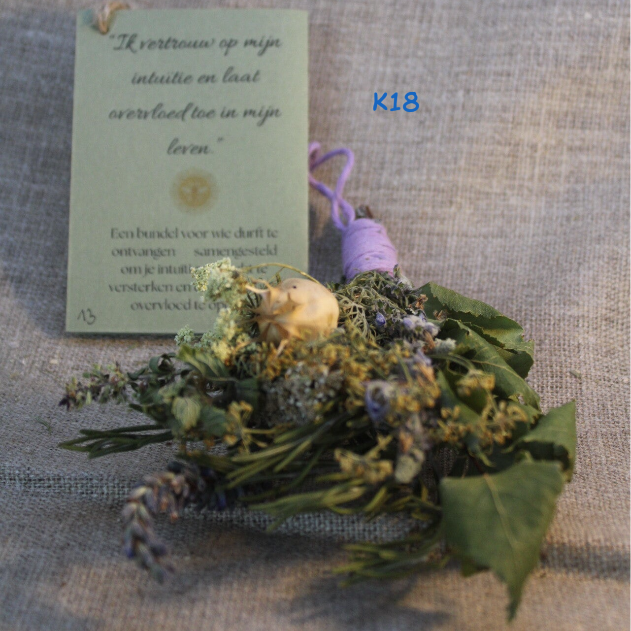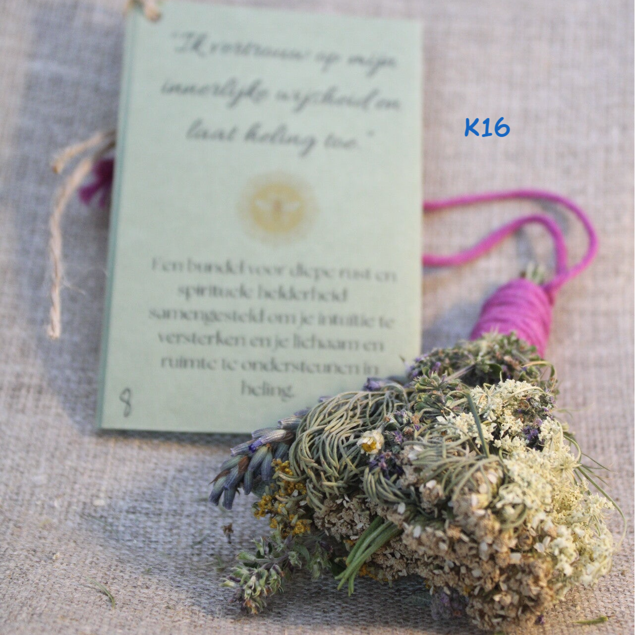 Elke bundel is uniek, met een eigen samenstelling van kruiden en veldplanten. Wat erin verweven zit, ontdek je op het bijgevoegde kaartje—een klein overzicht van de kruiden én hun symboliek. Zo weet je precies welke energie je in huis haalt, of aan een ander schenkt.